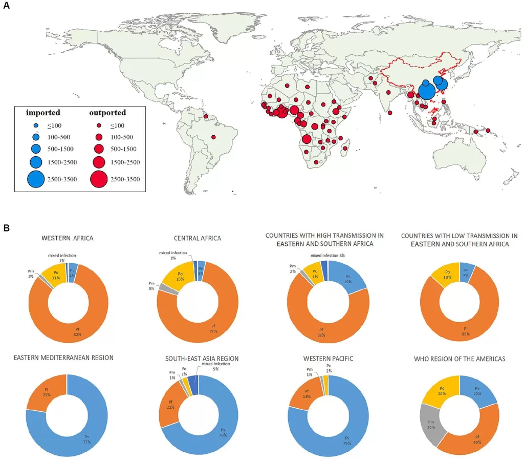 Imported malaria cases, particularly those caused by Plasmodium falciparum, are reported in Europe, with approximately 8,000 cases annually. Most cases arise from individuals returning from regions with high malaria prevalence, such as sub-Saharan Africa, highlighting the importance of monitoring and prevention strategies for vulnerable groups, including infants and pregnant women.