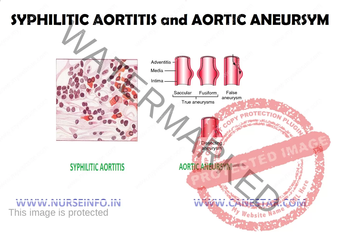 Syphilitic aortitis is an inflammatory condition of the aorta caused by the bacterium *Treponema pallidum*, the causative agent of syphilis. It is a rare but serious form of aortic disease that can occur in untreated syphilis cases, typically occurring long after the initial infection. This condition can lead to aortic aneurysms or dissection if not diagnosed and treated promptly.